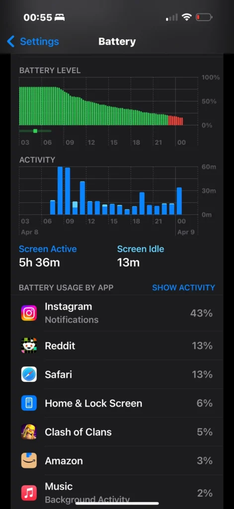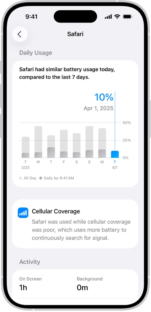بررسی بخش Battery Usage در تنظیمات، اپلیکیشنهای پرمصرف را مشخص میکند و مدیریت دقیقتری بر مصرف باتری زیاد آیفون ایجاد مینماید.
